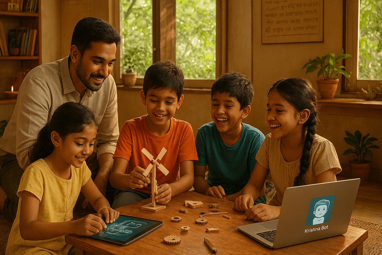 Each child interacts with an AI tutor, affectionately called Krishna Bot, that answers academic queries and supports inquiry-based learning. This model promotes self-directed exploration, where curiosity drives knowledge, not grades.